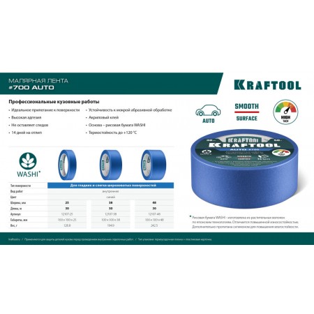 Малярная лента для маскирования поверхностей при работе с автомобилем стойка к УФ-лучам, влаге, температуре до 100°С, надежно приклеивается к поверхности, позволяя получившейся линии быть максимально ровной, без подтеков краски. Легко удаляется, сохраняя первоначальный вид поверхности, не оставляя после себя следов клея.