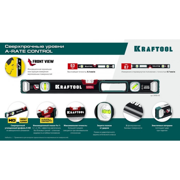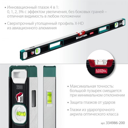 Сверхпрочный уровень A-RATE CONTROL, 2000 мм, точность 0.3 мм/м, с инновационным зеркальным глазком KRAFTOOL 34986-200
