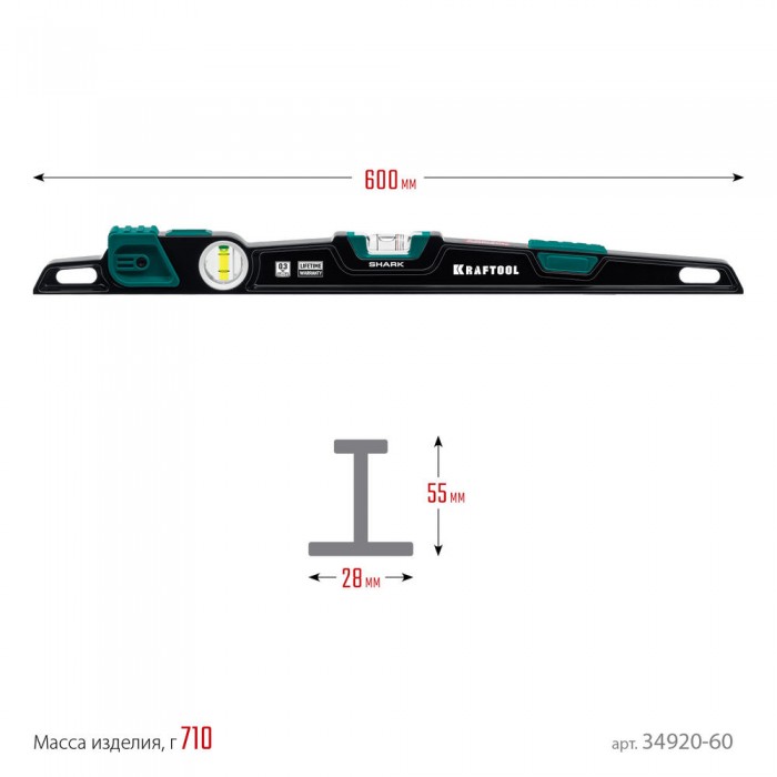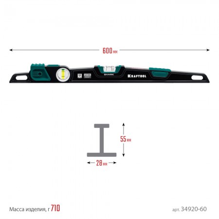 Литой уровень A-RATE CONTROL Shark, 600 мм, с инновационным зеркальным глазком KRAFTOOL 34920-60