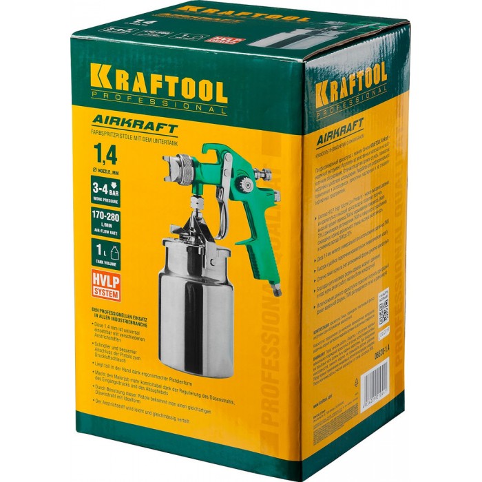 Пневматический краскопульт с нижним бачком AirKraft, HVLP, 1.4 мм KRAFTOOL 06520-1.4