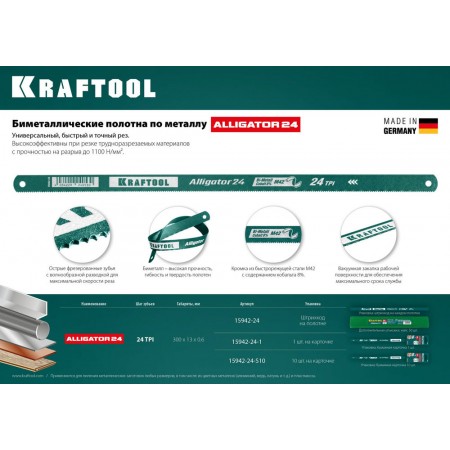 - Биметаллическое полотно KRAFTOOL применяется для пиления металлических заготовок с повышенной твер-достью. Универсальный шаг зубьев можно использовать для пиления заготовок различных размеров.