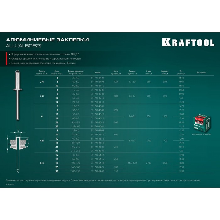 • Корпус заклёпки изготовлен из алюминиевого сплава AlMg2.5 и обладает высокой пластичностью и коррозионной стойкостью.