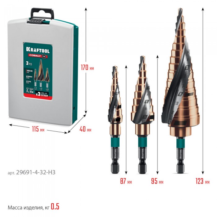 Набор сверл ступенчатых COBALT, 3 шт., 4–32 мм, азотирование, винтовая спираль KRAFTOOL 29691-4-32-H3