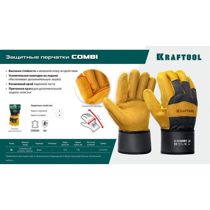 Комбинированные двухслойные спилковые перчатки COMBI, XL (10), с доп. слоем на ладони KRAFTOOL 11310-XL