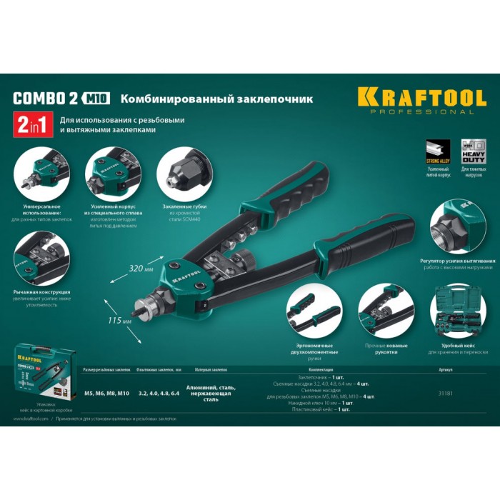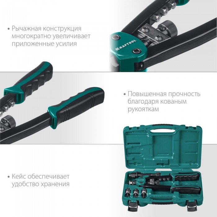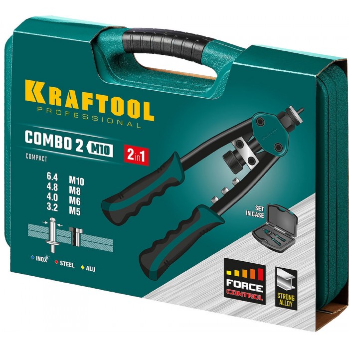 Комбинированный двуручный заклепочник KRAFTOOL - максимально компактный и надежный инструмент, который с легкостью выдерживает высокие нагрузки и предназначен для установки резьбовых и вытяжных заклепок из алюминия, стали и нержавеющей стали.