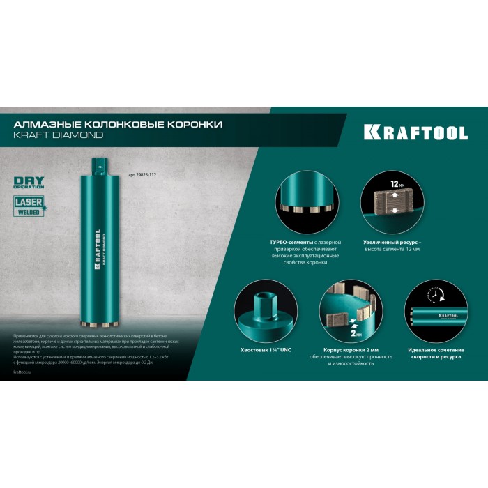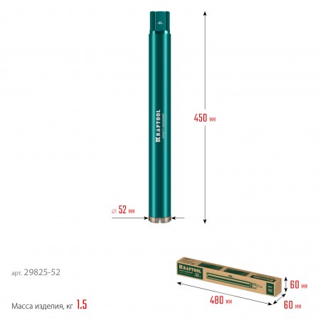 KRAFTOOL DIAMOND 52 мм (450 мм, 1 1/4?, лазерная сварка, сухое сверление с микроударом), алмазная коронка по железобетону (29825-052)