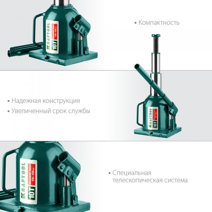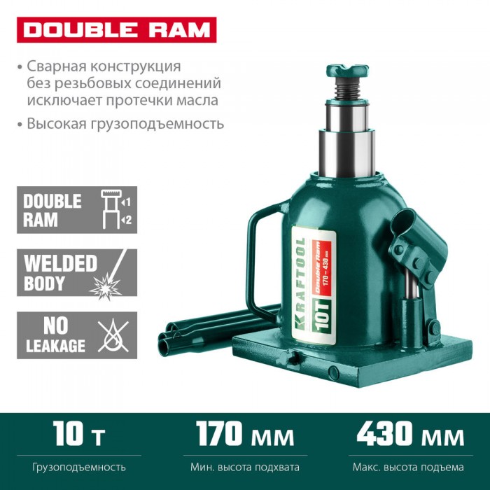 Домкрат бутылочный двухштоковый 10 т, 170 - 430 мм с увеличенным подъемом DOUBLE RAM KRAFTOOL 43463-10