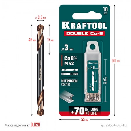 Сверло двухстороннее 3.0?46 мм по металлу DOUBLE Сo-8 сталь M42+8%Co класс А KRAFTOOL 29654-3.0-10