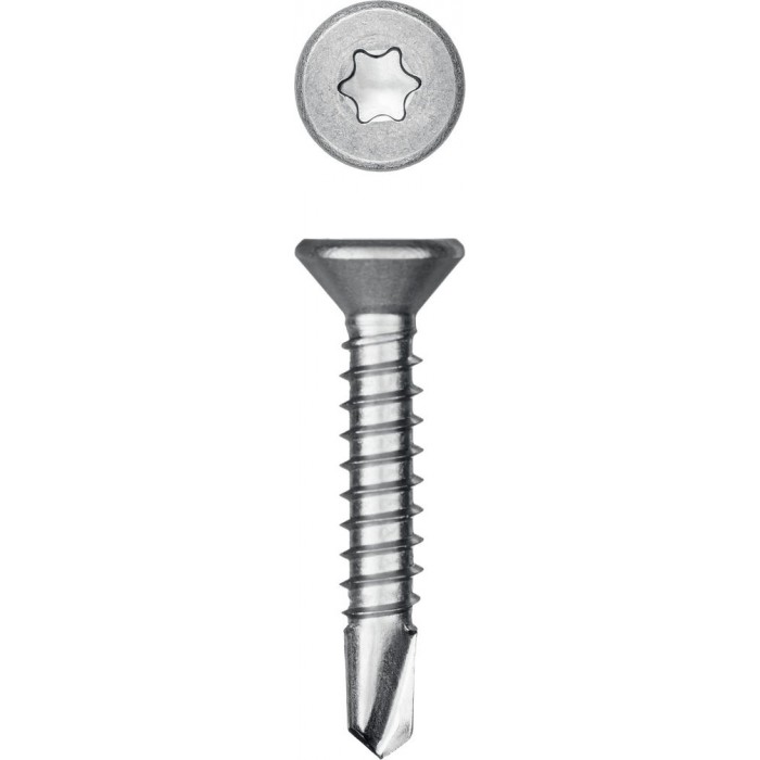 Саморезы с потайной головкой и сверлом изготовлены в соответствии со стандартом DIN7504P из нержавеющего прутка. Легирование никелем, хромом и марганцем полностью сохраняет аустенитную структуру кристаллической решетки, благодаря чему нержавеющие саморезы обладают хорошей прочностью и пластичностью, немагнитными свойствами и невысокой электропроводностью. Саморезы легко вкручиваются обычным шуруповертом или отверткой.