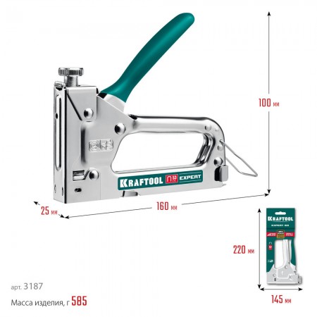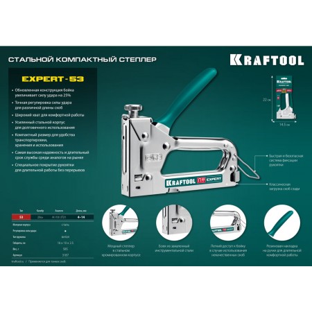 Профессиональный cтеплер. Увеличенное отверстие для хвата, противоскользящая рукоятка. Плавная регулировка силы удара. Стальной хромированный корпус. Пружина и боек из закалённой стали.