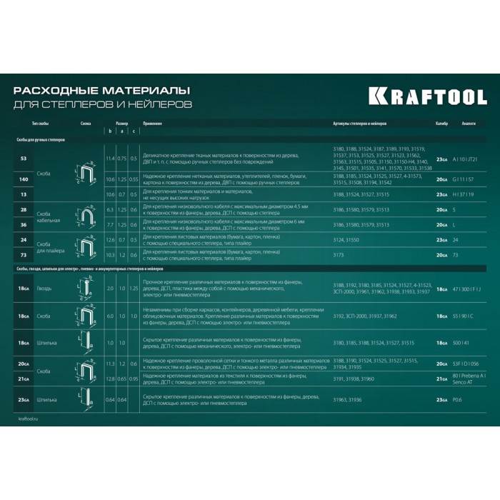 53 (A|3|11) для крепления тканных материалов(ткани, обивки, холста) и материалов не несущих высоких нагрузок к поверхности из дерева, ДВП, пластика и т.п. Тонкая проволока не повреждает волокна материалов.