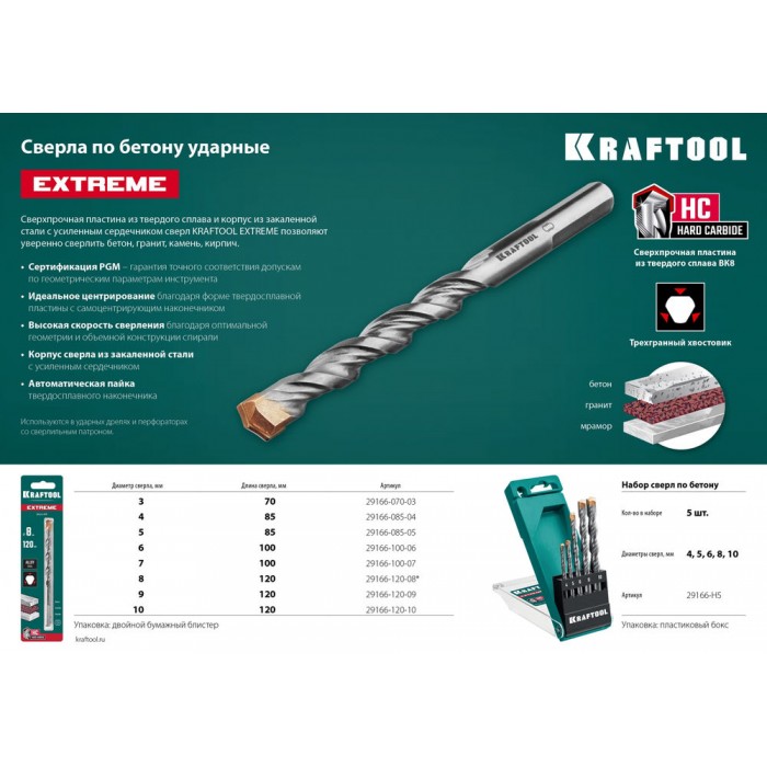 Сверло по бетону Extreme, 7 х 100 мм, трехгранный хвостовик KRAFTOOL 29166-100-07