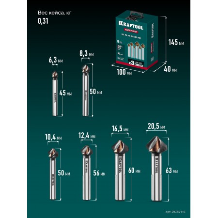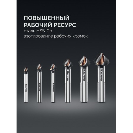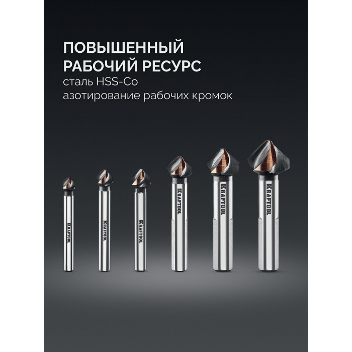 KRAFTOOL EXTREME Со5-А, 6 шт (6.3, 8.3, 10.4, 12.4, 16.5, 20.5 мм), Z3, 90°, сталь M35, U-образная спираль, набор зенковок (29734-H6)