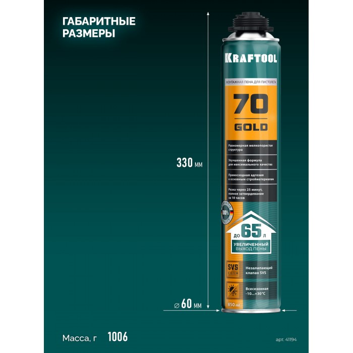 Профессиональная полиуретановая всесезонная монтажная пена GOLD PRO 65 произведена на профессиональном оборудованиии. Благодаря новой улучшенной формуле отличается превосходным качеством и обладает характеристиками, позволяющими использовать ее для широкого круга задач. Используется с монтажным пистолетом