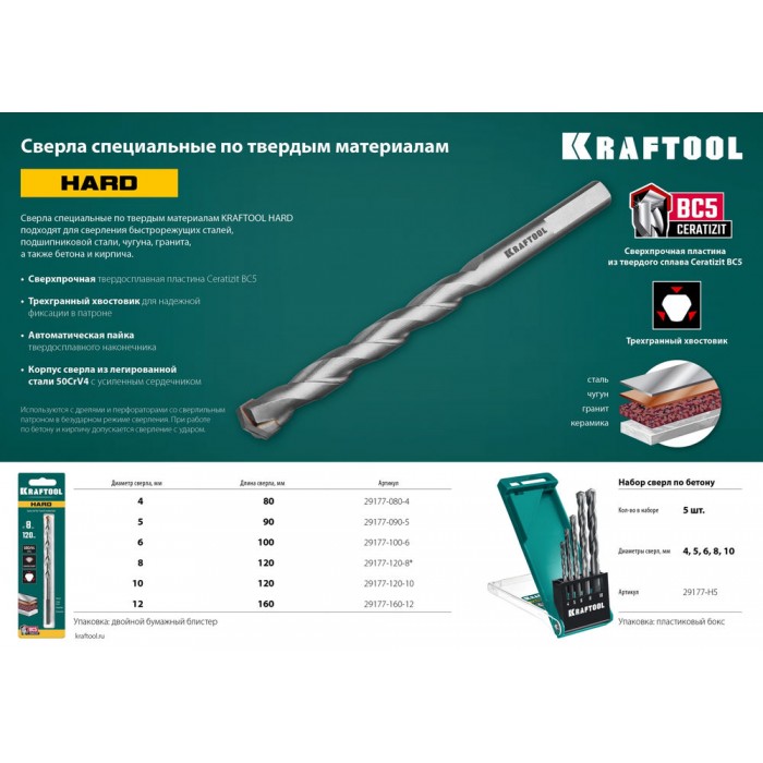 Сверла специальные HARD по твёрдым материалам подходят для сверления быстрорежущих сталей, подшипниковой стали, чугуна, керамики, гранита, а также бетона и кирпича.