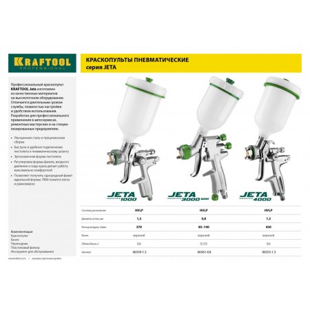 Краскопульт KRAFTOOL Jeta 1000 - это идеальный вариант для профессионалов, которые нуждаются в качественном и максимально комфортном в работе инструменте.