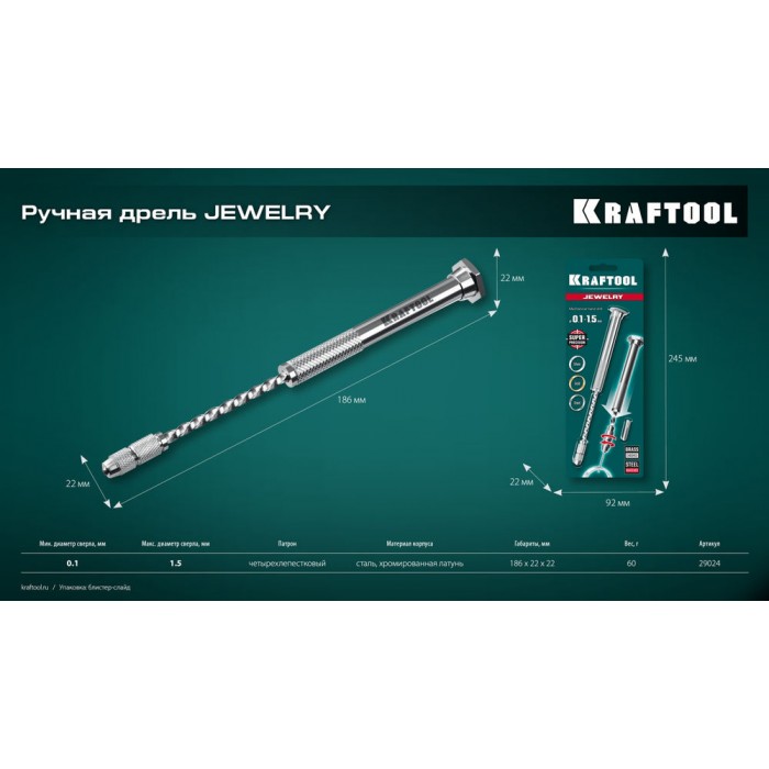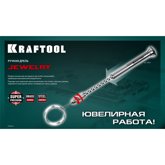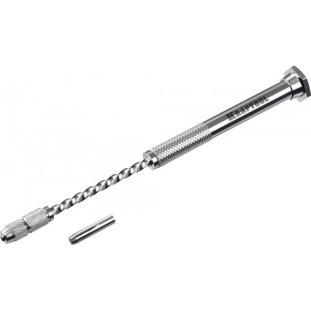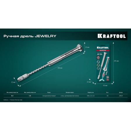 Профессиональная механическая ручная дрель KRAFTOOL Precision для особоточных ювелирных и электронных работ. Механизм вращения из закаленной стали. Корпус из хромированной латуни. Два стальных четырёхлепестковых зажима в комплекте. Для свёрл Ø 0,1-1,5 мм. Два полных оборота сверла за одно нажатие. Большой ресурс. Простота в использовании. Незаменимый помощник для работ требующих повышенной аккуратности.