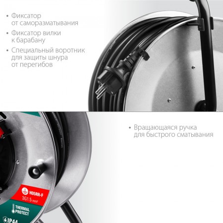 - Катушка позволяет легко сматывать и разматывать кабель, обеспечивая мобильное перемещение и компактное хранение.