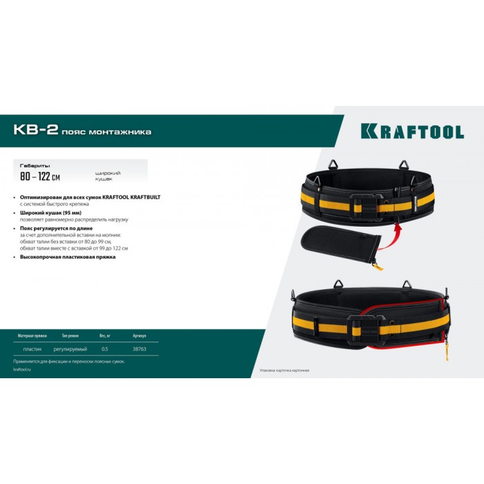 Пояс монтажника 80-122 см для сумок с быстросъёмным креплением FastClip, широкий кушак KB-2 KRAFTOOL 38763
