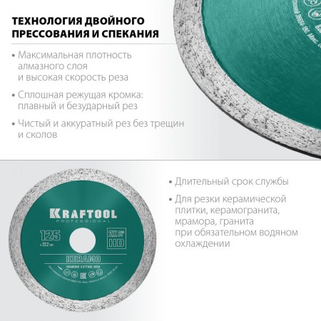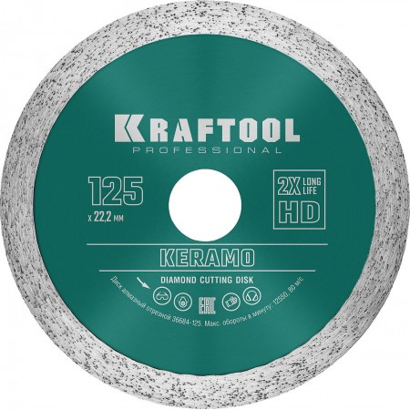 Сплошной алмазный диск KERAMO, 125 мм, (22.2 мм, 10 х 1.6 мм) KRAFTOOL 36684-125