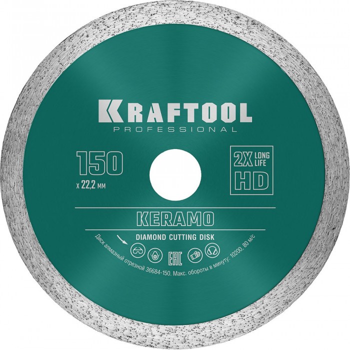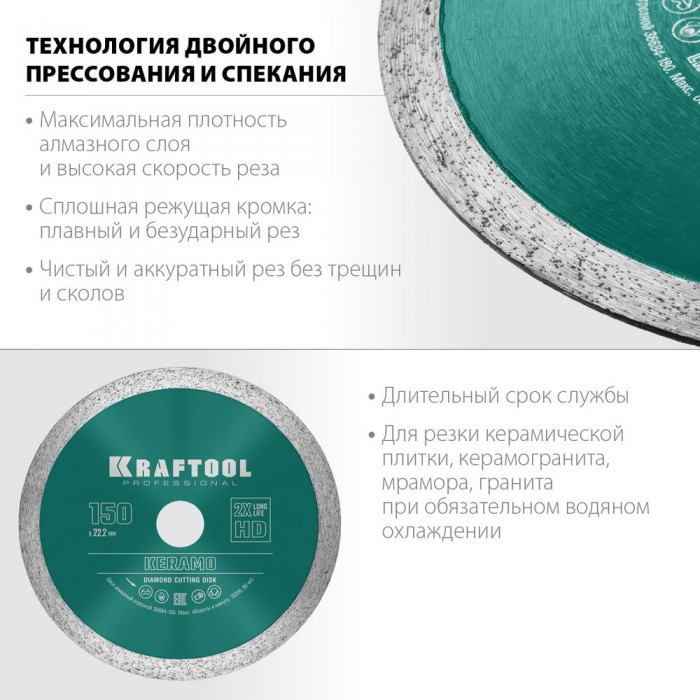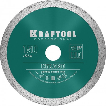 Сплошной алмазный диск KERAMO, 150 мм, (22.2 мм, 10 х 1.8 мм) KRAFTOOL 36684-150