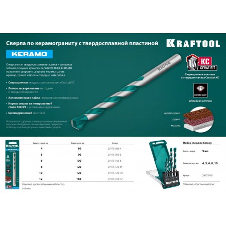 Набор сверл по керамограниту Keramo, 5 шт: 4-5-6-8-10 мм, с твердосплавной пластиной KRAFTOOL 29175-H5