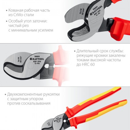 Профессиональный электромонтажный инструмент KRAFTOOL изготовлен из высококачественной стали и предназначен для работ под напряжением до 1000 В, использовать для перекусывания гибких проводников, изготовленных только из цветных металлов