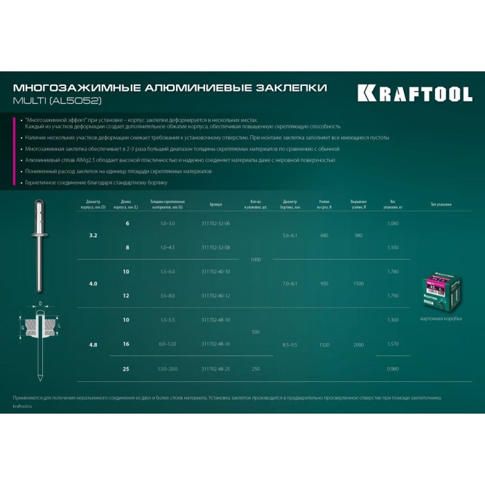 Многозажимные алюминиевые заклепки Multi (Al5052), 4.0 x 10 мм, 1000 шт KRAFTOOL 311702-40-10