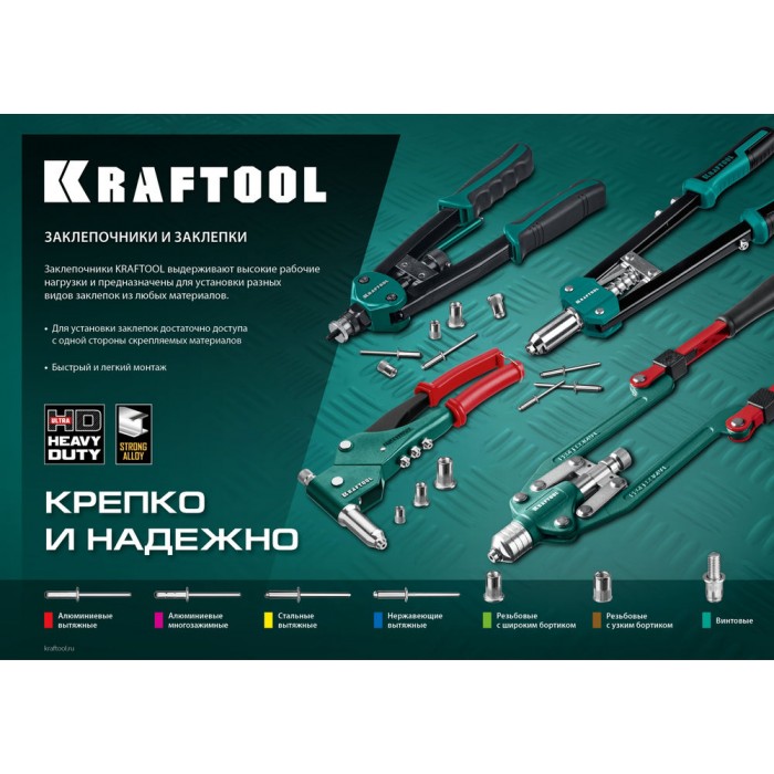 Для получения неразъемного соединения из двух и более слоев материала. Установка заклепок производится в предварительно просверленное отверстие при помощи заклепочника.