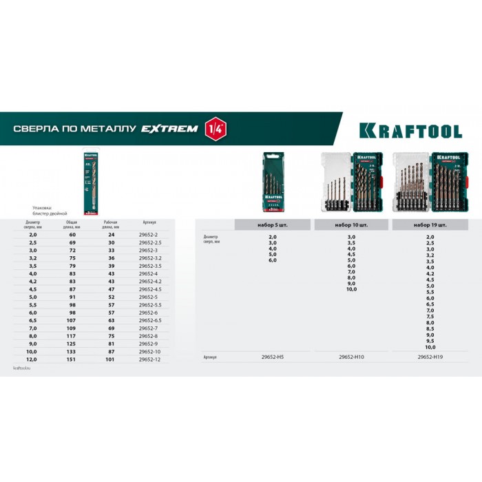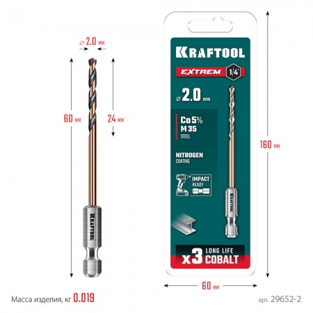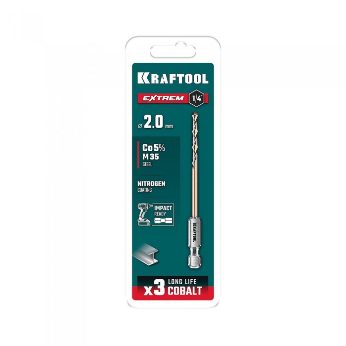 Сверло по металлу для винтовёртов и шуруповертов IMPACT READY НЕХ-1/4", d 2.0 х 60 мм KRAFTOOL 29652-2