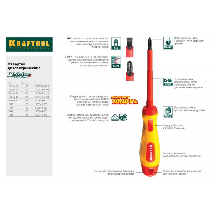 Профессиональная диэлектрическая отвертка для проведения слесарно-монтажных работ. Стержень изготовлен их хромомолибденовой стали на высокоточном оборудовании