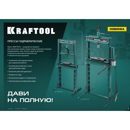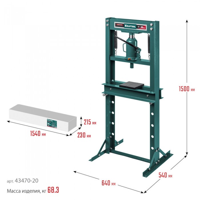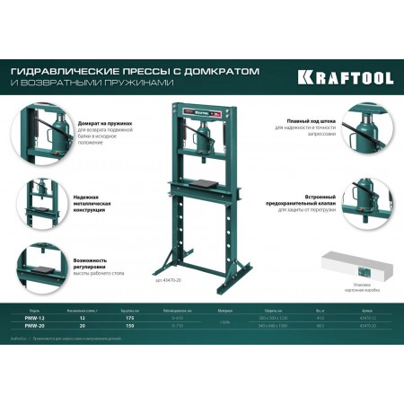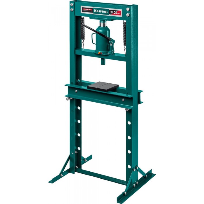 Пресс KRAFTOOL - мощный инструмент для запрессовки деталей. Отличается прочной металлической конструкцией. Широкое Н-образное основание надежно крепится к полу анкерными болтами. Силовым элементом пресса является домкрат, который при работе опускает подъемную платформу и запрессовывает деталь