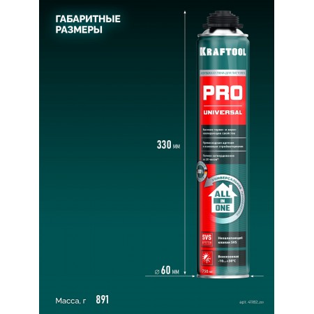 Kraftlex PRO - профессиональная полиуретановая монтажная пена, отличается превосходным качеством и надежностью, которые являются результатом многолетнего опыта производства. Используется с пистолетом.
