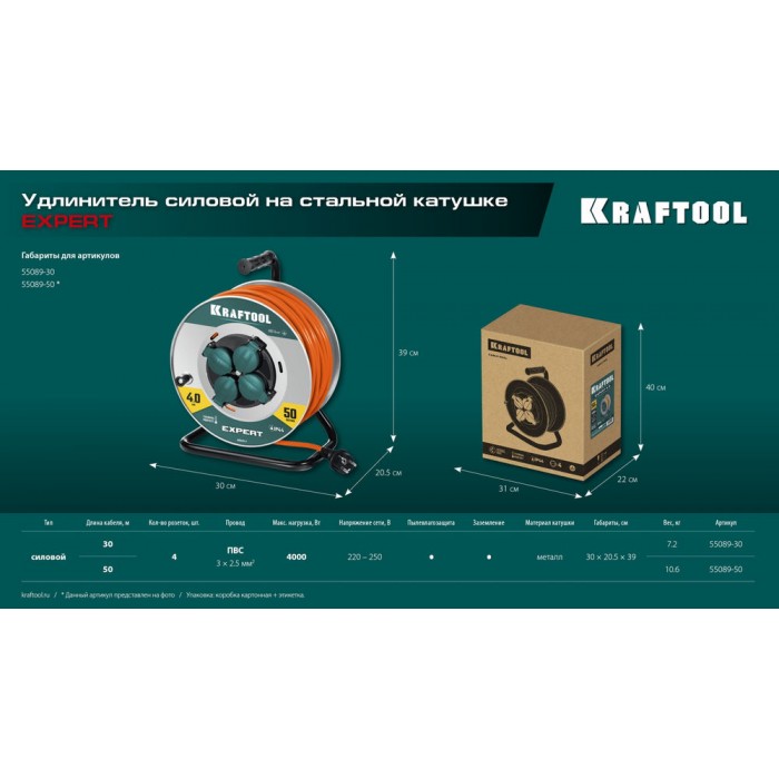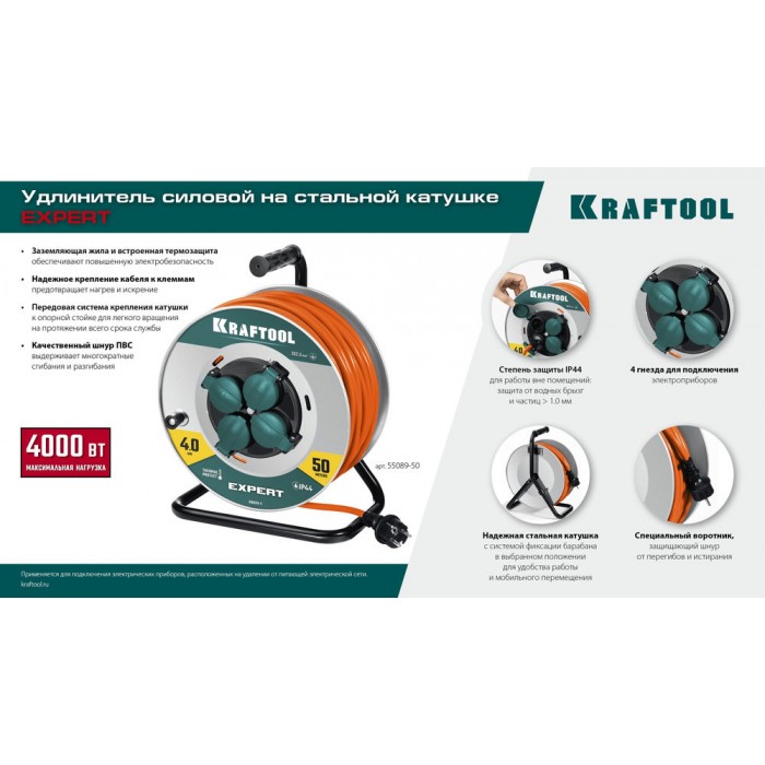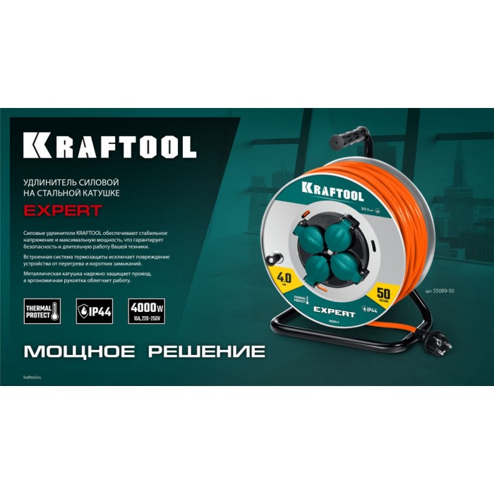 Силовой удлинитель на стальной катушкеEXPERT ПВС 3х2.5 50м 4000Вт IP44 KRAFTOOL 55089-50