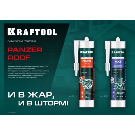 Кровельный силиконовый герметик 300мл Kraftool 41258-4 - долговечный силиконовый материал широкого спектра применения для выполнения профессиональных монтажных работ, например: герметизации соединени при проведении кровельных работ внутри и снаружи помещения, стыках водостока, герметизации швов в кровле. Состав изделия позволяет герметику сохранять свои эксплуатационные характеристики под солнечными лучами, в дождь и в холод. Герметик быстро затвердевает под действием влажности воздухв, обладает высокой эластичностью и адгезией к большинству материалов (металлы, стекло, древесина, керамика, пластик, окрашенные поверхности). Отличается устойчивостью к влаге, атмосферным воздействиям и химическим веществам. Температура нанесения: от +5 до +40 °С, температура эксплуатации от -40 до +80 °С