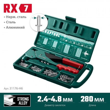 Заклепочник KRAFTOOL выдерживает высокие рабочие нагрузки и предназначен для установки заклепок из алюминия, стали и нержавеющей стали различных диаметров согласно таблице.
