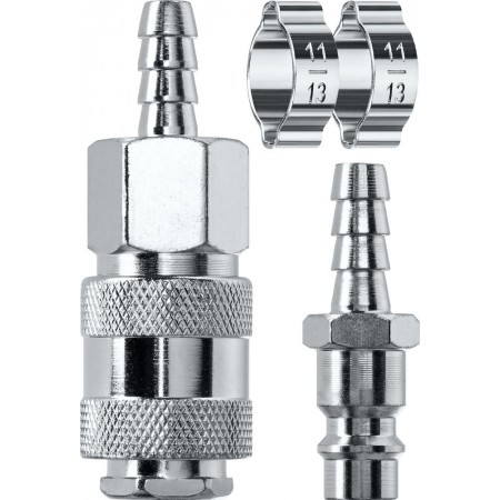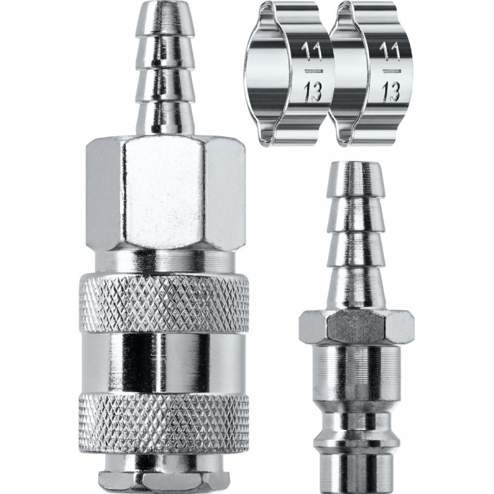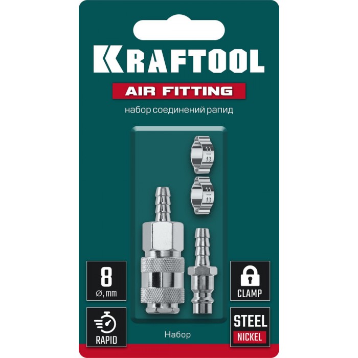 Набор (штуцер «елочка», 8 мм — рапид муфта) + (рапид штуцер-штуцер «елочка», 8 мм) + (обжимные хомуты 2 шт) KRAFTOOL 06599-08-H