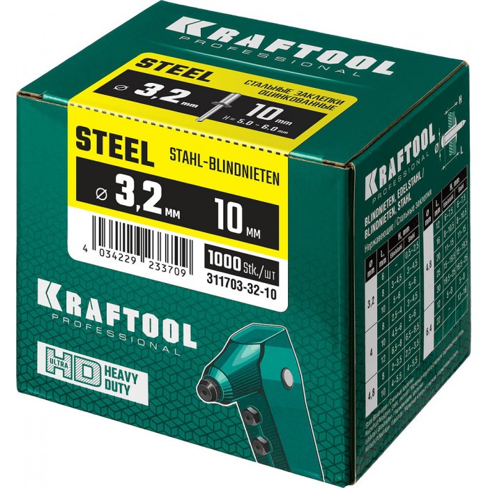 Стальные заклепки Steel, 3.2 x 10 мм, 1000 шт KRAFTOOL 311703-32-10
