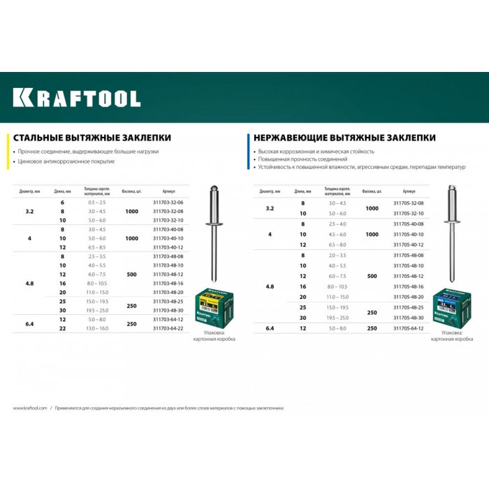 Для получения неразъемного соединения повышенной прочности из двух и более слоев материала. Установка заклепок производится в предварительно просверленное отверстие при помощи заклепочника.