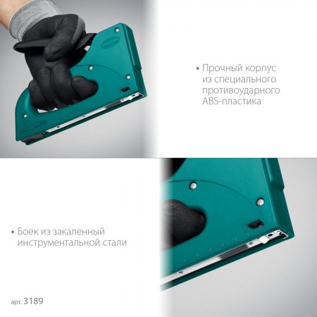 Профессиональный степлер с высокопрочным лёгким удобным корпусом из ударопрочного АБС пластика. Обладает повышенным ресурсом, обеспечивает длительную и качественную работу.