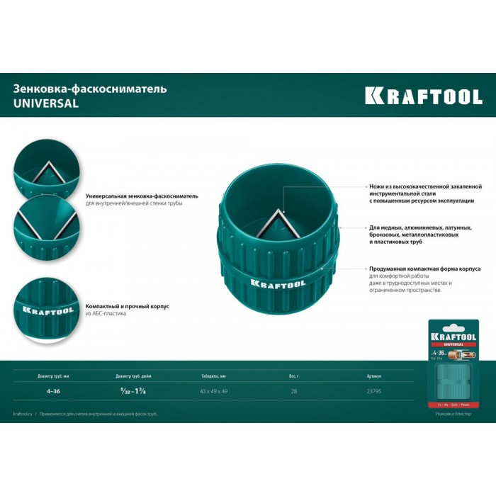 Универсальный внутренний и внешний фаскосниматель для медных, алюминиевых, латунных, бронзовых, металлопластиковых и пластиковых труб. Благодаря высокоточным мультилезвийным ножам, изготовленым из закаленной инструментальной стали, обеспечивает быстрое и точное снятие фаски