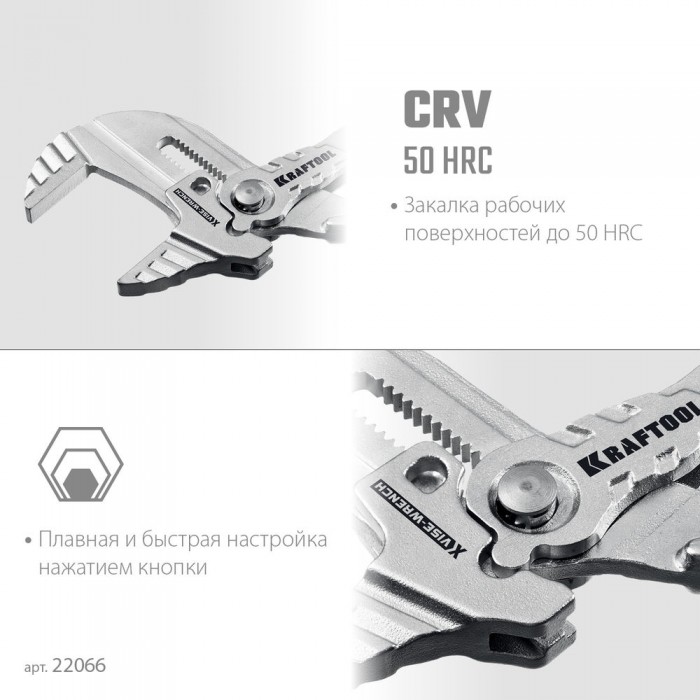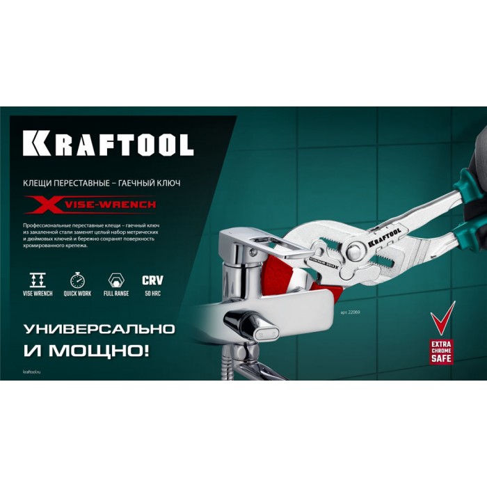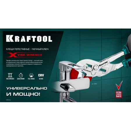 Клещи переставные-гаечный ключ KRAFTOOL – профессиональный инструмент с постоянно параллельными губкам. Заменит набор из всех ключей и обеспечит полную сохранность хромированного крепежа.