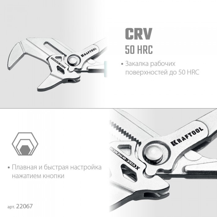 Клещи переставные-гаечный ключ KRAFTOOL – профессиональный инструмент с постоянно параллельными губкам. Заменит набор из всех ключей и обеспечит полную сохранность хромированного крепежа.