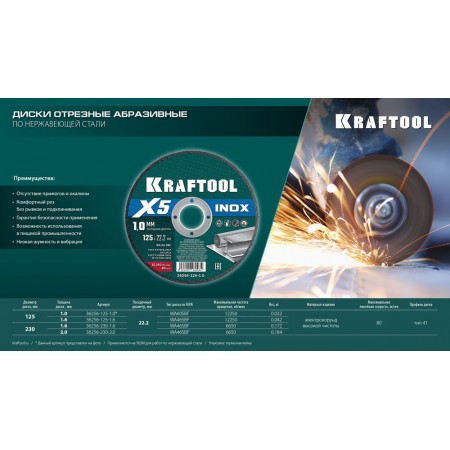 Отрезной диск для УШМ X5 INOX, 125x1.0 мм, по нерж. стали KRAFTOOL 36256-125-1.0
