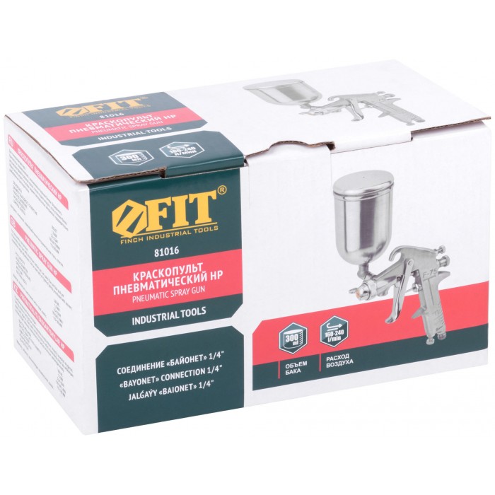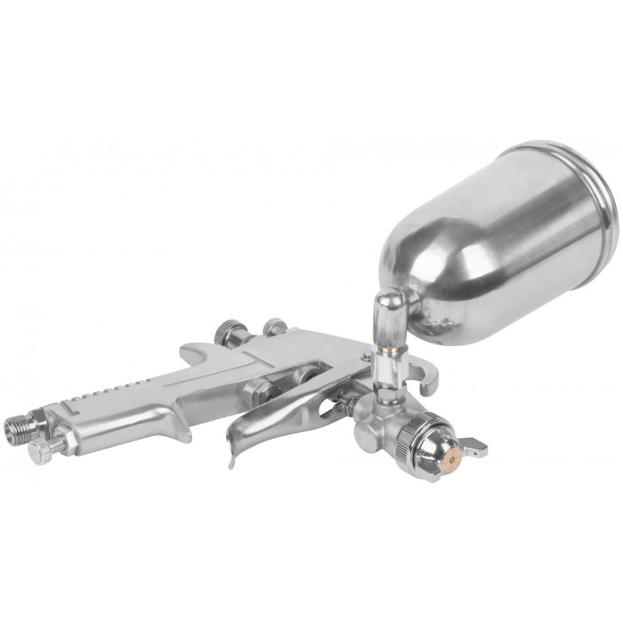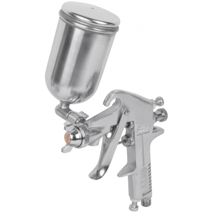 рабочее давление 3,5 - 5 бар, ширина факела 110-180 мм. Материал: алюминий. Для пневмокомпрессора. Cоединение байонет. С алюминиевым верхним бачком. Возможность регулировки: факела, расхода краски, потока подачи воздуха, угла установки бачка. Используется с: водоэмульсионными красками, синтетическими эмалями, полиуретановыми эмалями, эпоксидными эмалями, нитроэмалями.