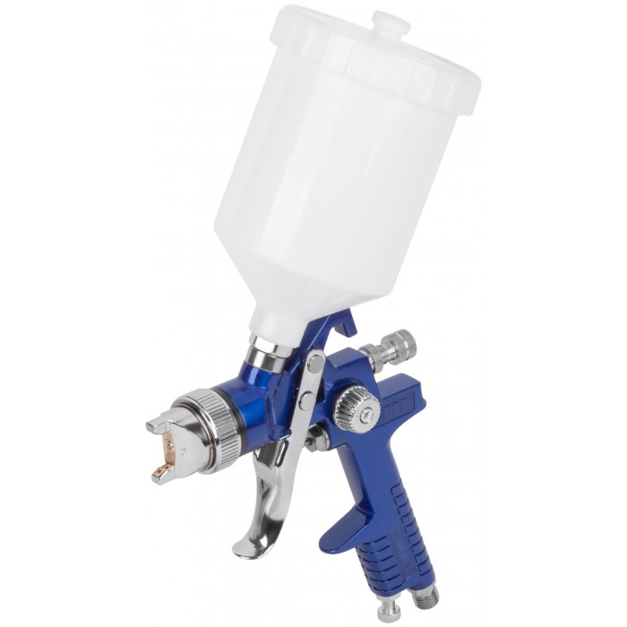 Краскопульт пневматический, 600 мл; 1,4 мм; расход воздуха 160 - 220 л/мин; рабочее давление 2,0 - 3,5 бар; ширина факела 160 - 240 мм. Материал: алюминий, сталь, пластик. Для пневмокомпрессора. Соединение байонет. С пластиковым верхним бачком. Возможность регулировки: факела, расхода краски и потока подачи воздуха. Используется с водоэмульсионными красками, синтетическими эмалями, полиуретановыми эмалями, эпоксидными эмалями, нитроэмалями, лаками и грунтовками.
