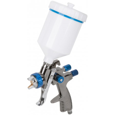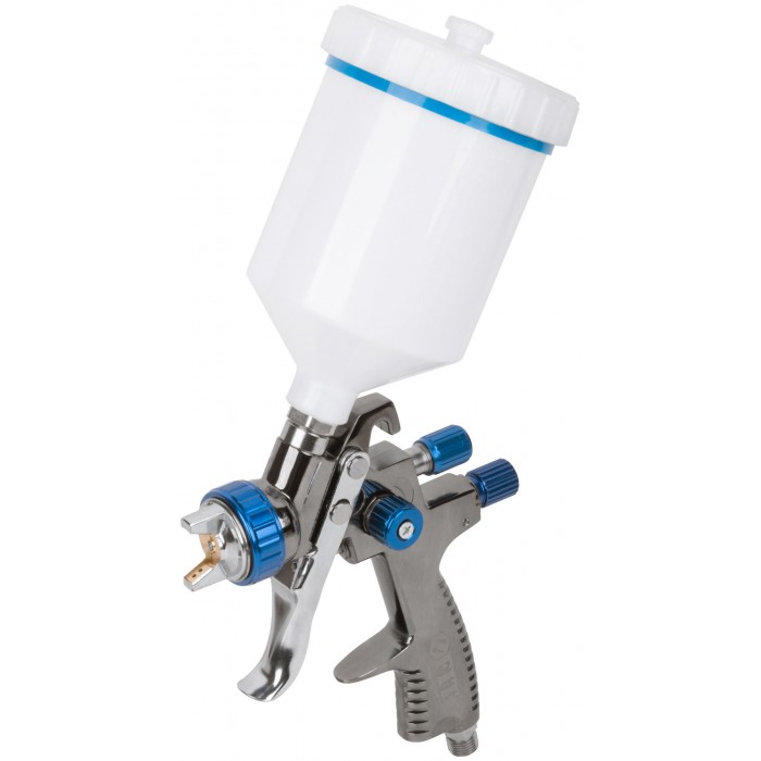 рабочее давление 2-3,5 бар; ширина факела 160-250 мм. Материал алюминий. Для пневмокомпрессора. Соединение быстросъемное. С пластиковым верхним бачком. Возможность регулировки: факела, расхода краски, потока подачи воздуха. Используется с: водоэмульсионными красками, синтетическими эмалями, полиуретановыми эмалями, эпоксидными эмалями, нитроэмалями, лаками.