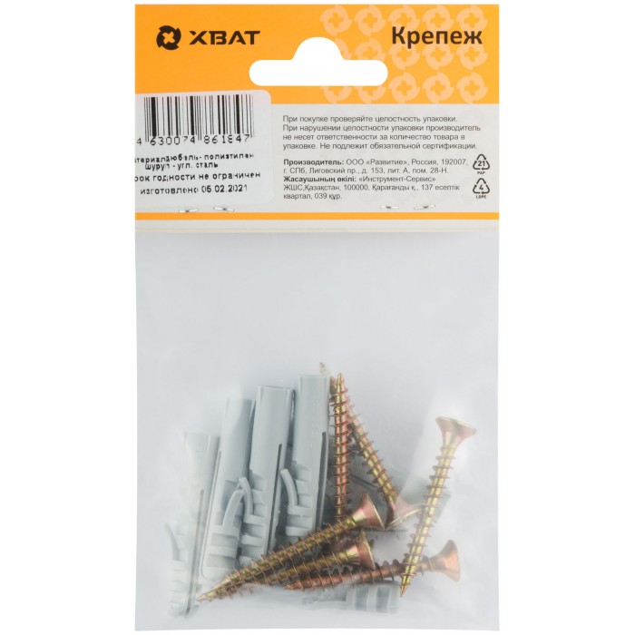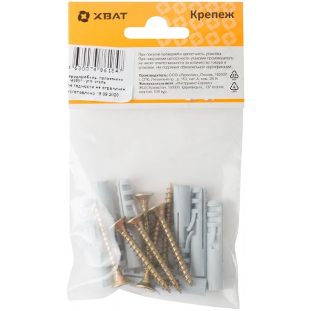 Дюбель изготовлен из полипропилена, шуруп - из стали. Используется для крепления плинтусов и других конструкций.