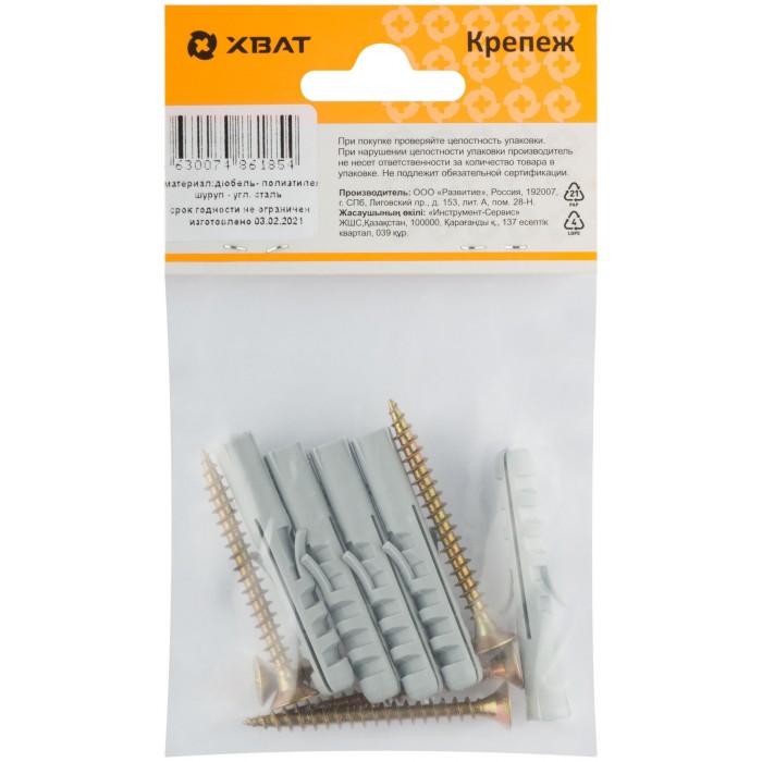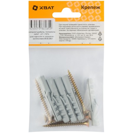 Дюбель изготовлен из полипропилена, шуруп - из стали. Используется для крепления плинтусов и других конструкций.