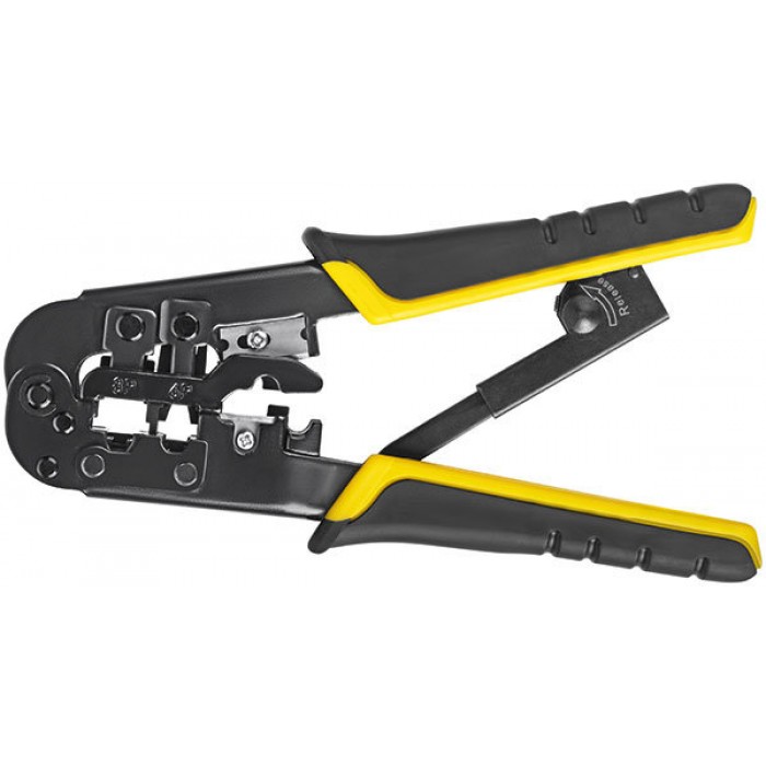 Для обжима разъемов RJ45, RJ11, RJ12. Для подключения компьютеров и телефонных аппаратов к сетям. Встроенные лезвия для разрезания и снятия изоляции с плоских кабелей и круглых кабелей типов UTP и STP. Храповый механизм блокирует обратный ход обжимной матрицы, что исключает риск слабой опрессовки разъема. Специальная скоба защищает пальцы от случайных порезов и помогает правильно расположить провод под лезвиями. Материал: корпус из инструментальной стали, лезвия из высокоуглеродистой инструментальной стали SK5, пластиковые прорезиненные ручки. Упаковка: блистер.